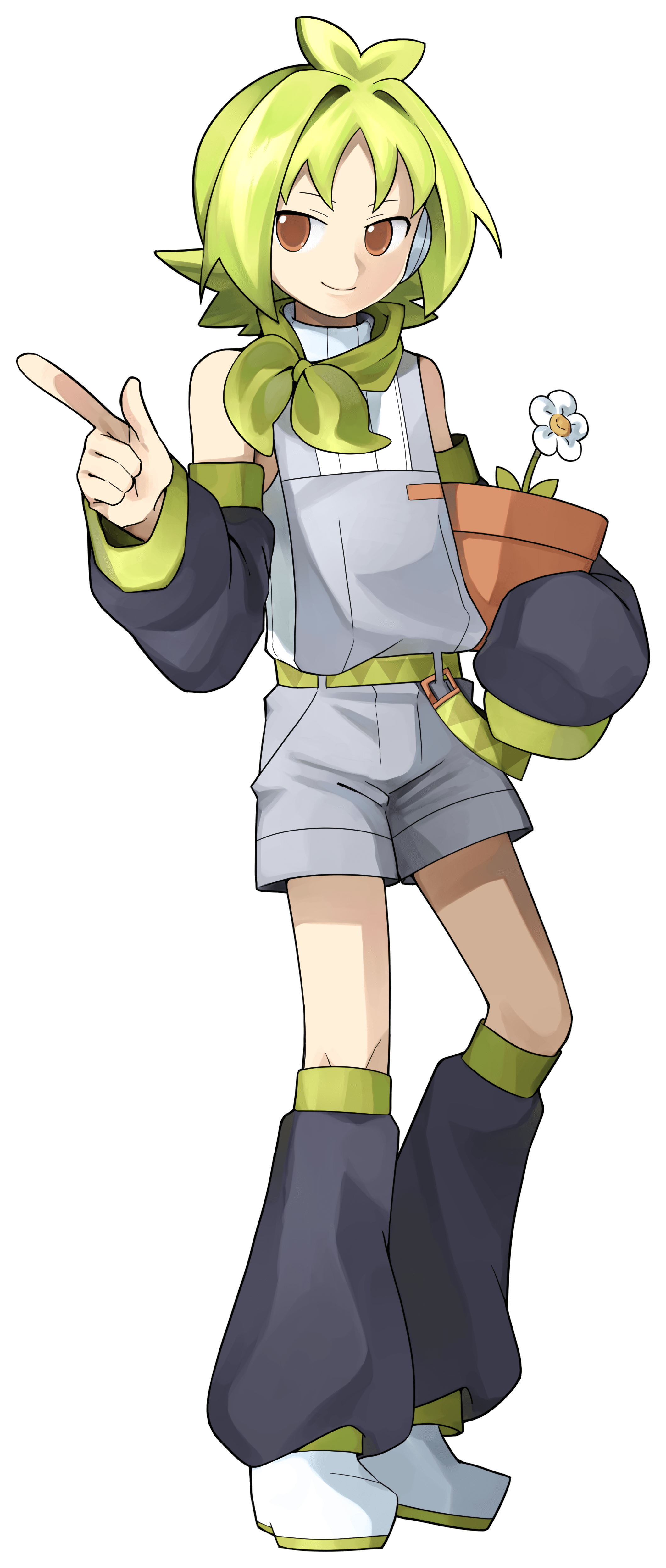 Description: short, light matcha green hair with a cowlick on the top of her head, resembling a sprout. She has orange eyes, fair skin, and a slim, androgynous physique.