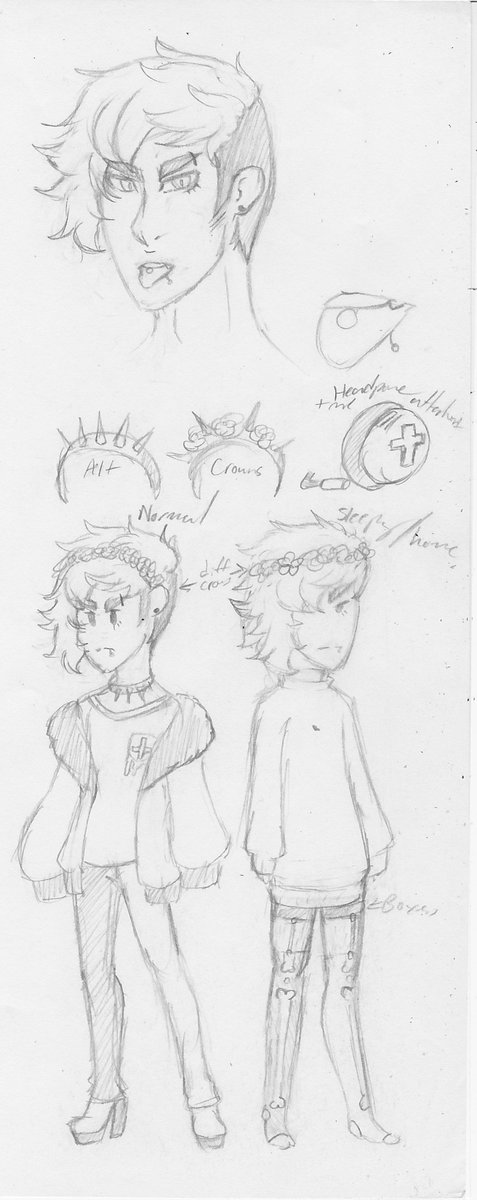 Y-San is meant to be pastel goth in most of his designs. He has two headbands that double and can attache headphones + a optional mic. He doesn't care the original gender of clothes and willingly wears women's clothes. All designs have either heels , pumps or creepers (so any heeled shoes) but he doesn't wear anything flat. His colors are always pastel unless its blacks, grays and whites.